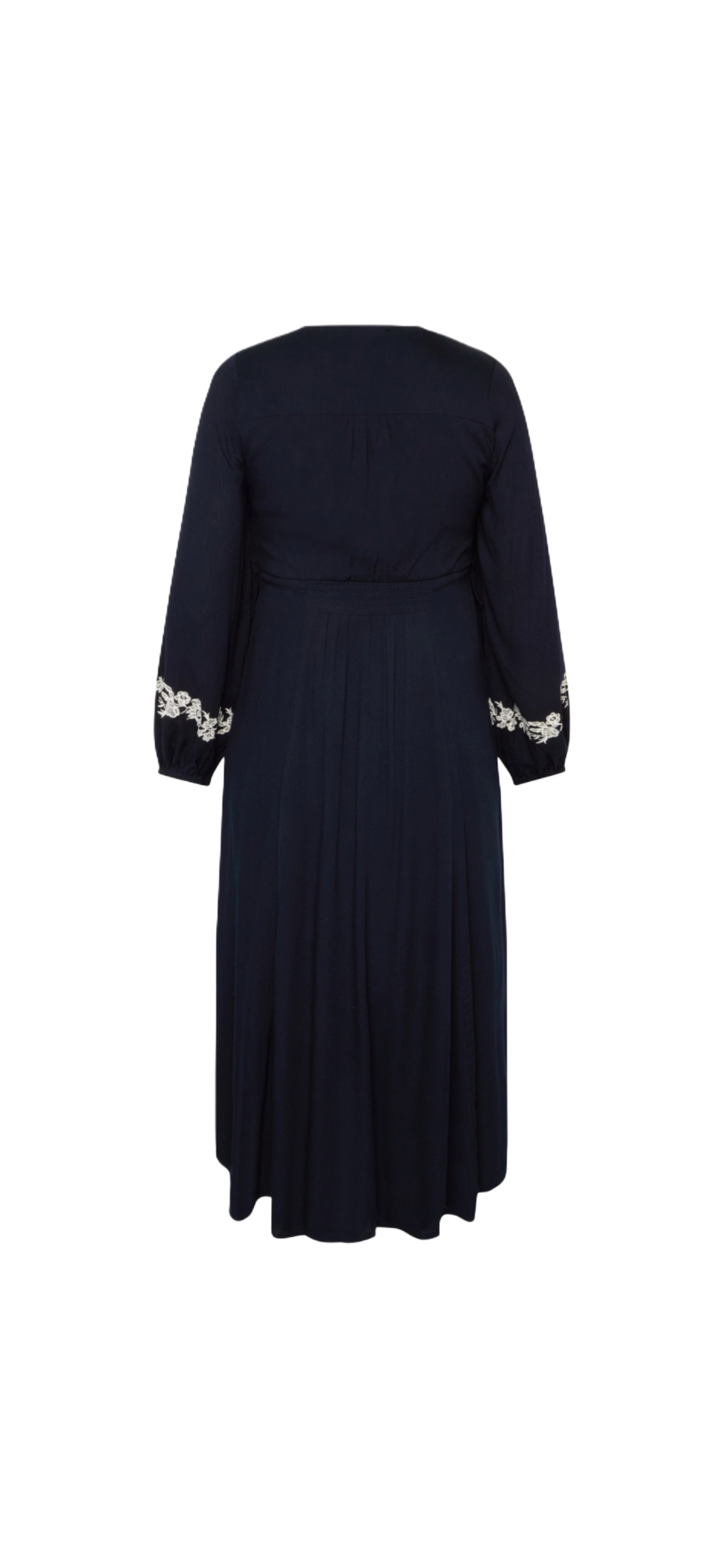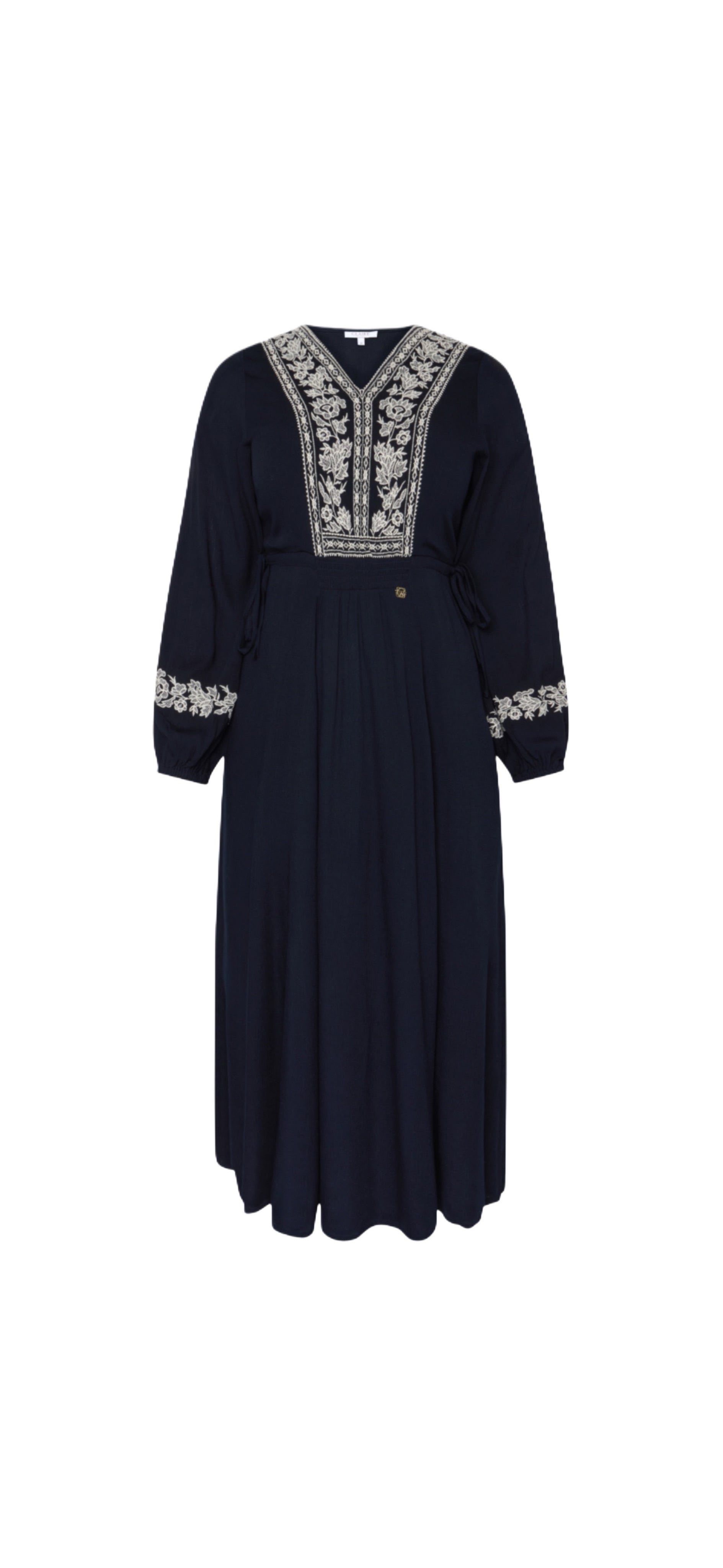 Lang kjole i viskose med broderte detaljer og V-hals. Modellen er designet med puffermer og elastiske ermer. Kjolen har justerbare snorer i sidene og en vaffelsøm i midjen for en tilpasset passform.