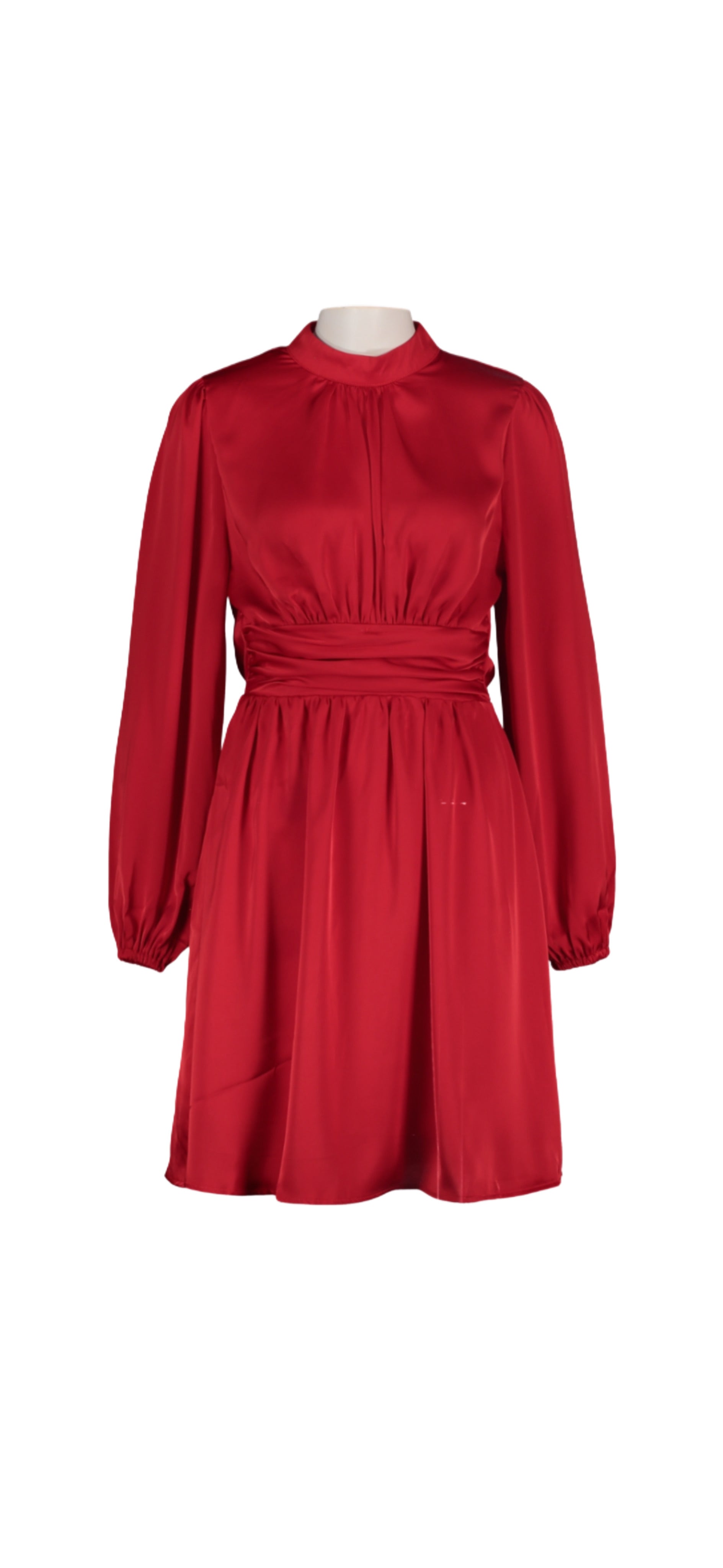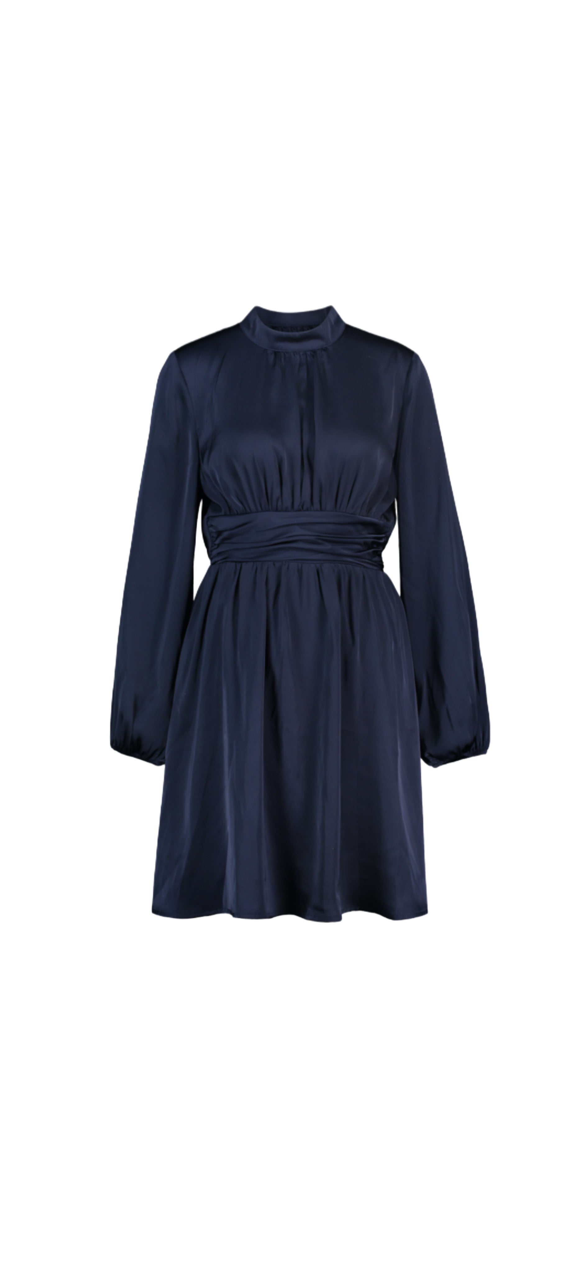 Kjole i myk sateng med en glatt og blank overflate. Høy hals med knapper i nakken. Lange ermer med legg på skuldrene og tynn strikk nederst. Markert midje med drapering foran, og tynn strikk i ryggen. A-formet skjørt. Mykt fòr inni.