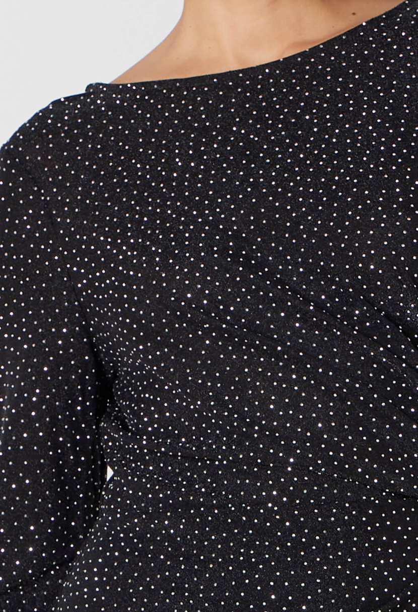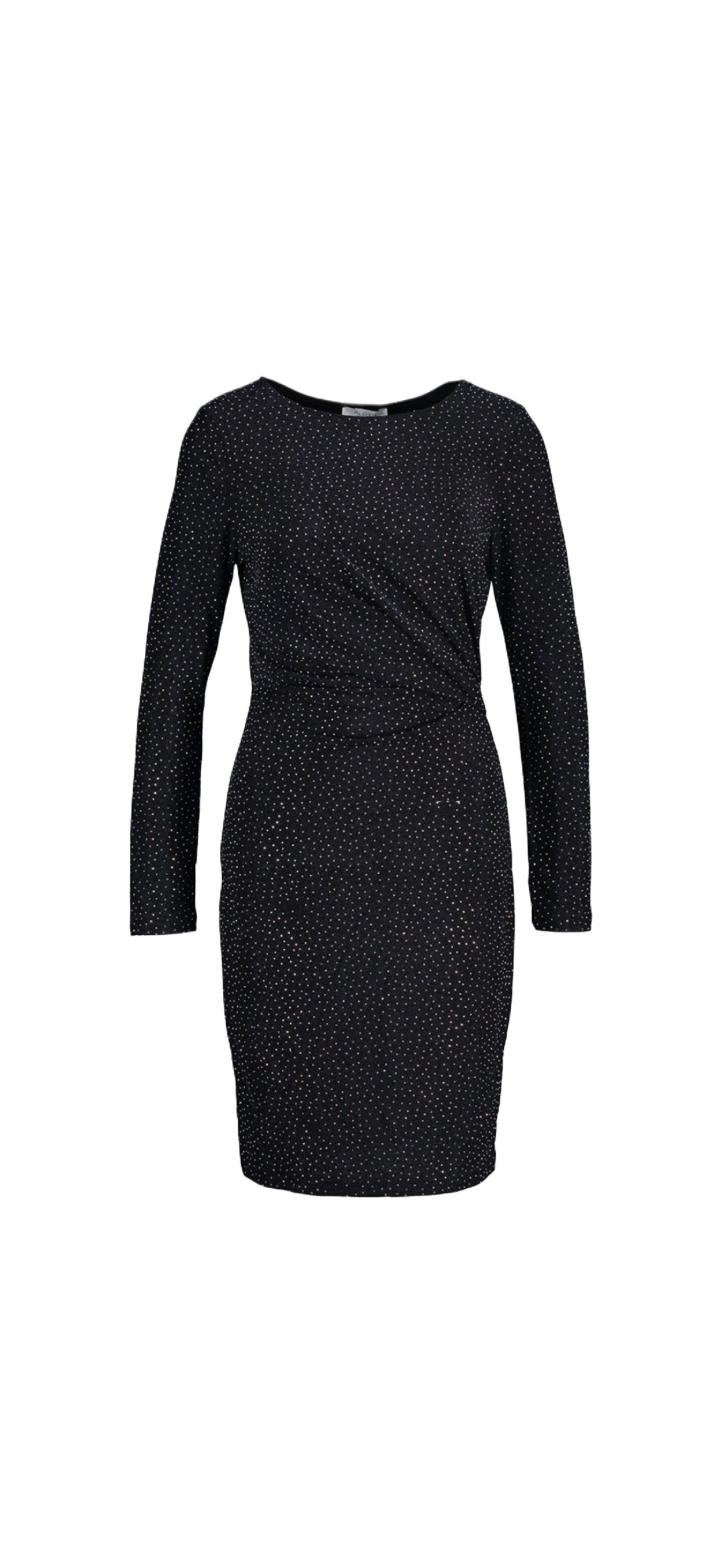Ettersittende kjole med en shiny look. En svart kjole med metalliske svarte tråder og sølvfarget, glitrende strass over hele kjolen. Den har rund hals og lange smale ermer. Draperinger i den ene siden av kjolen for en flatterende silhuett. Den har en myk og glatt innside. Kjolen er ikke fòret.