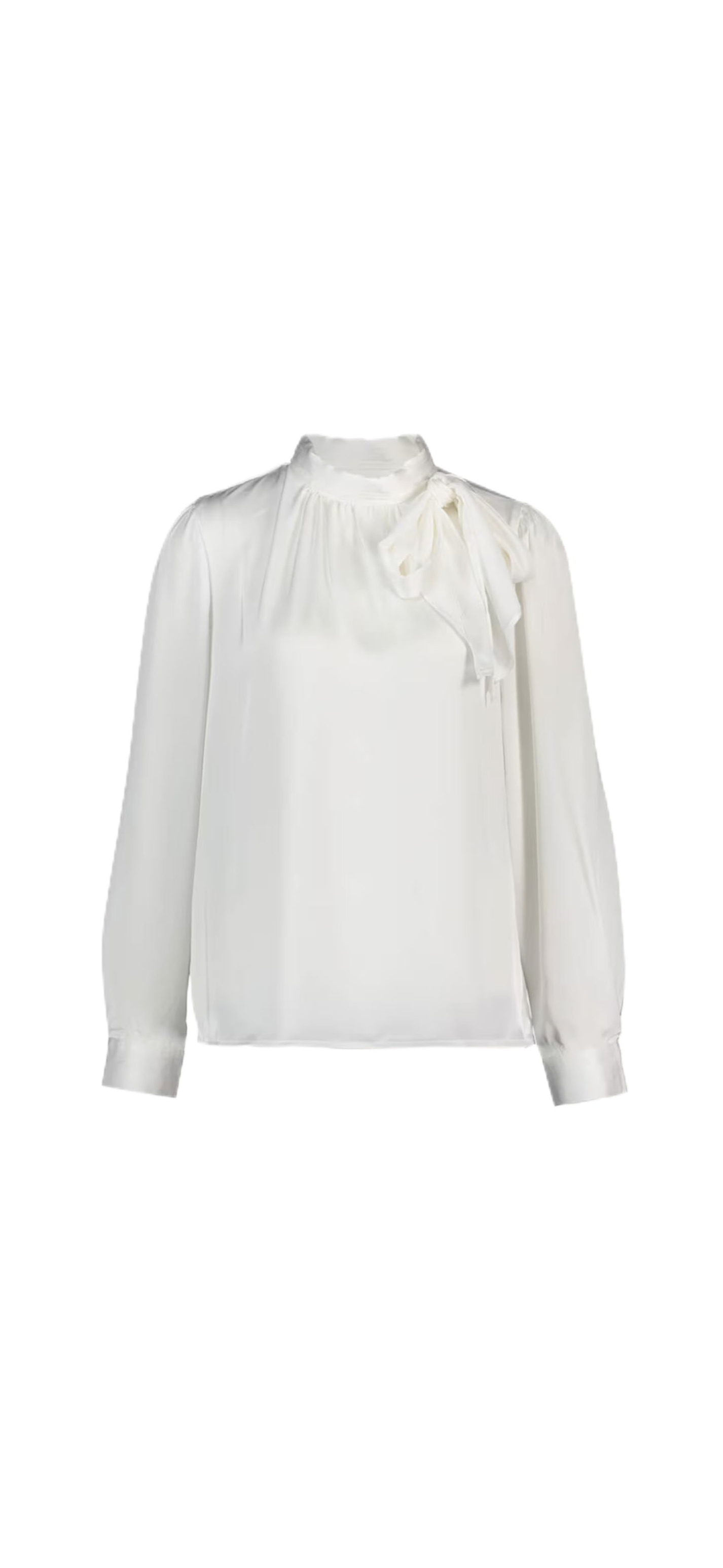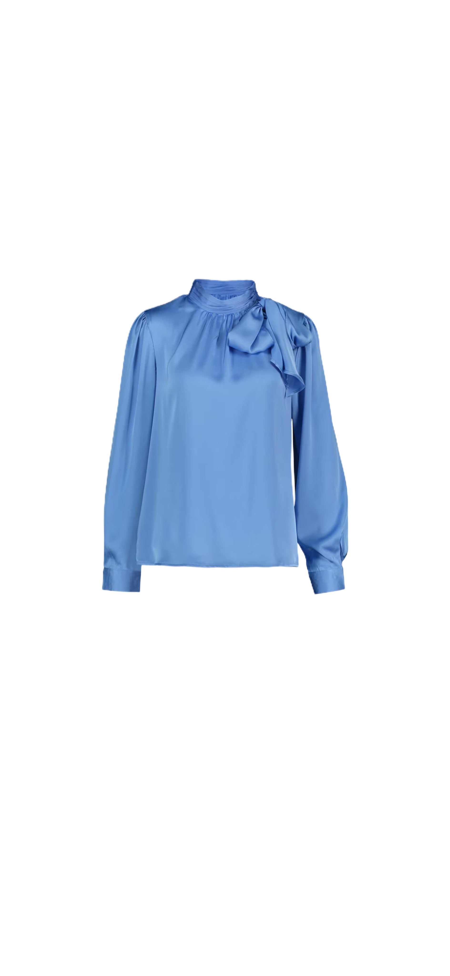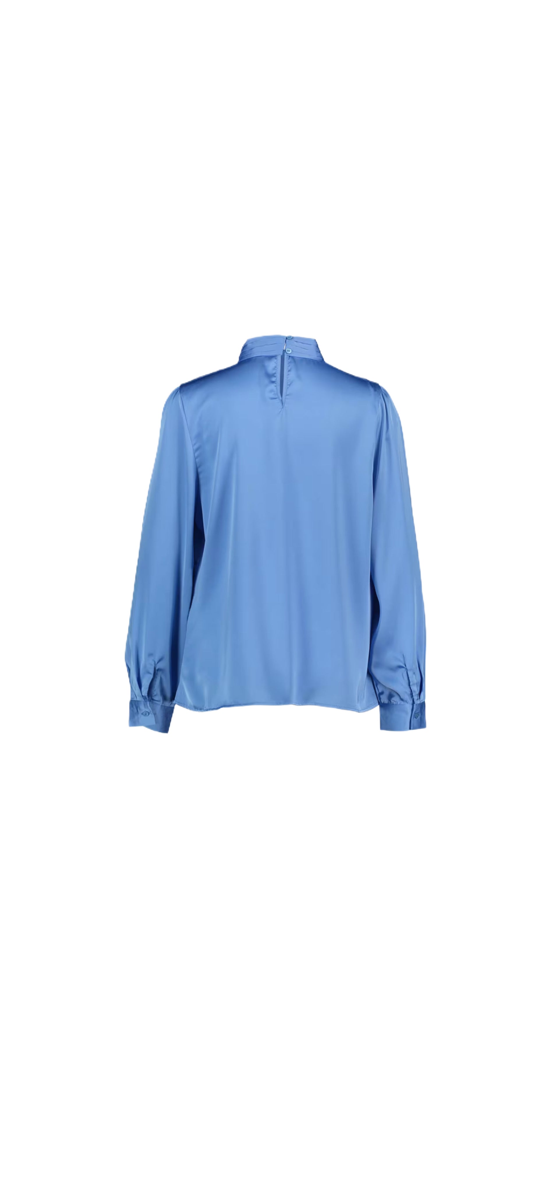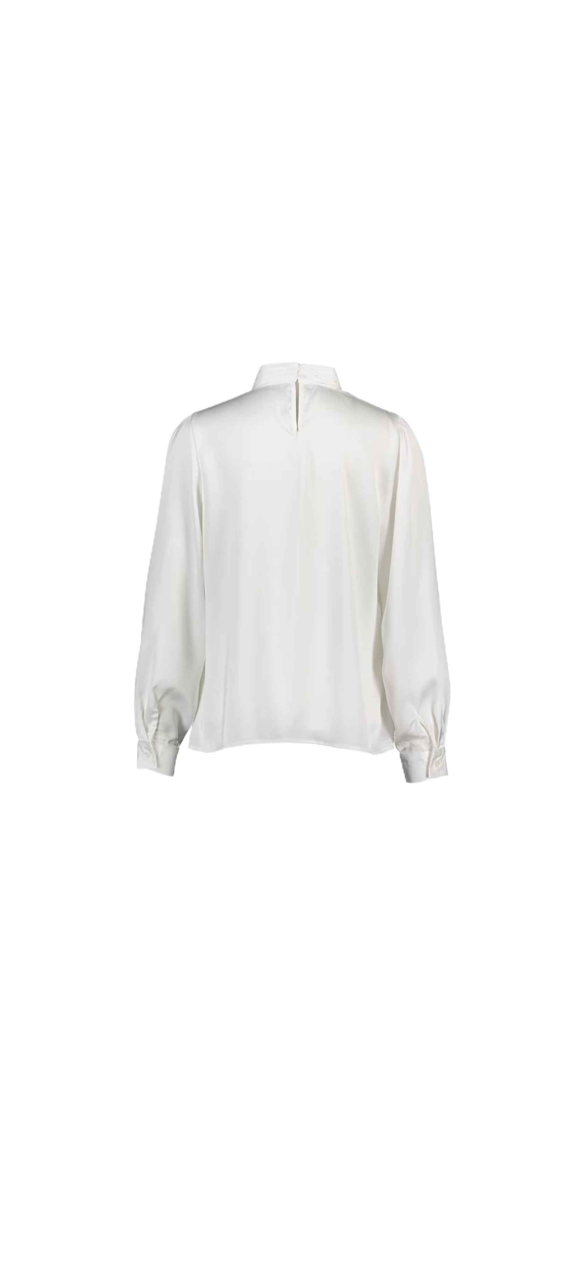 Malle er en bluse i myk sateng med en glatt og shiny overflate. Den har høy hals med draperte detaljer og sløyfe i den ene siden. To små knapper i nakken. Lange ermer med små legg på skuldrene og smale mansjetter med en knapp ytterst