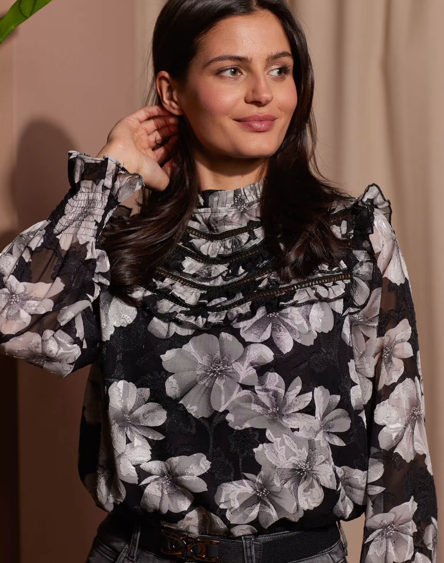 Bluse i chiffon med blomsterprint. Sølvfarget tråd gir en svak shimmer-effekt til blusen. Den er ikke fòret i ermene, så disse oppleves noe gjennomsiktige.