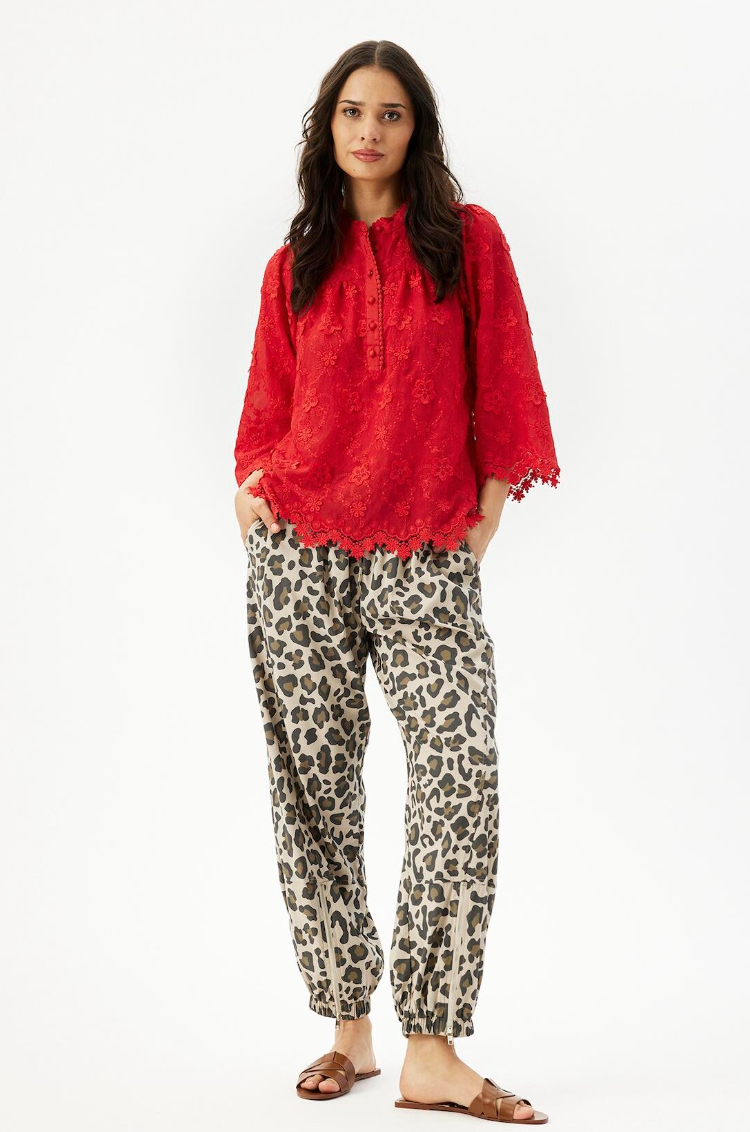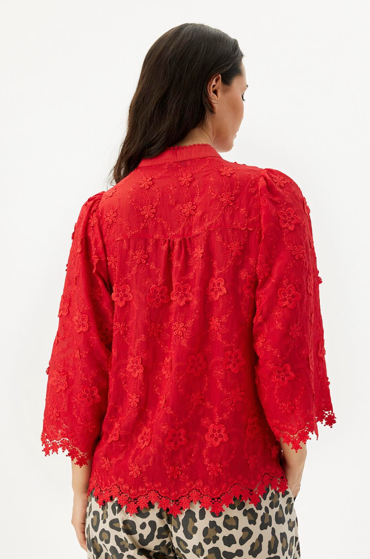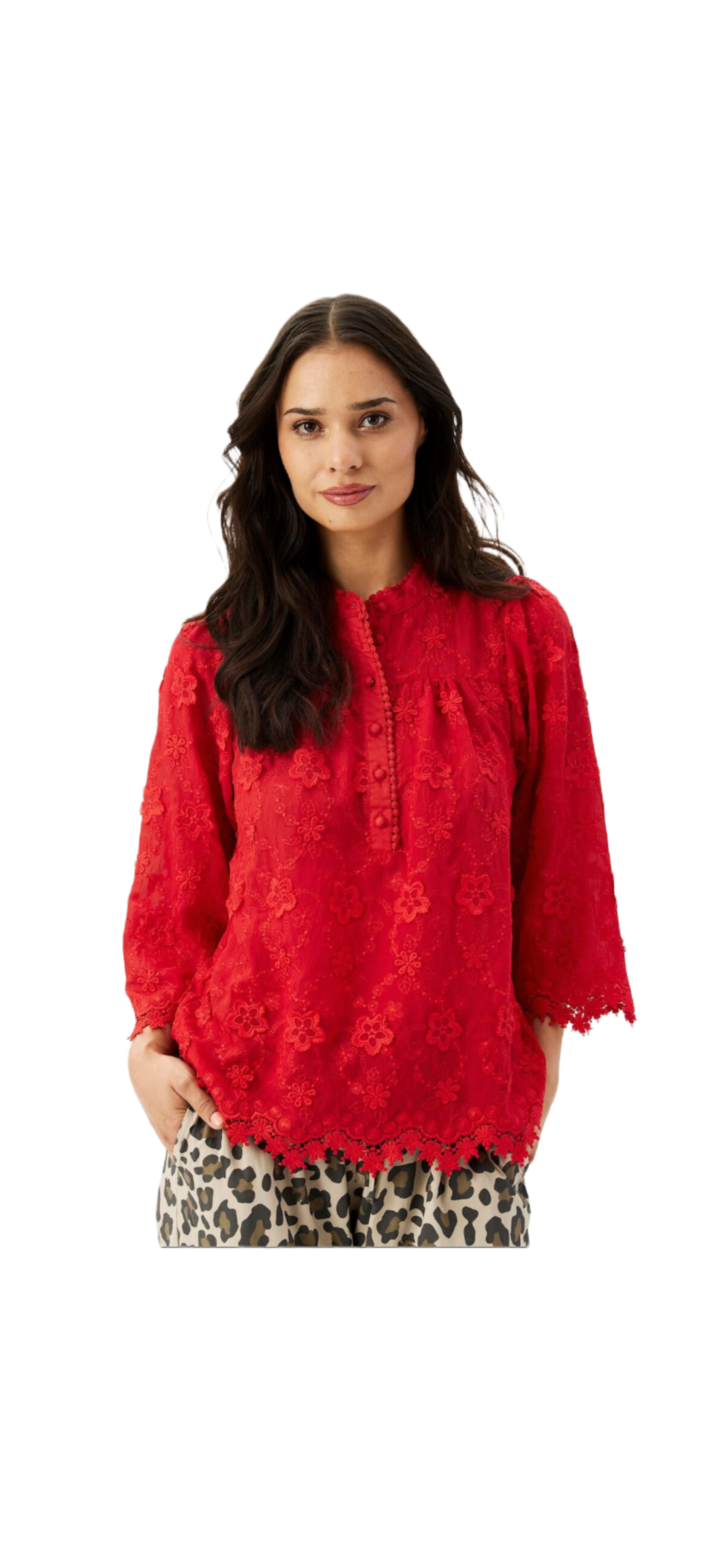 Vakker blouse fra In Front med gylden rødfarge. Blousen har flotte blomster detajler med knepper i halsen.