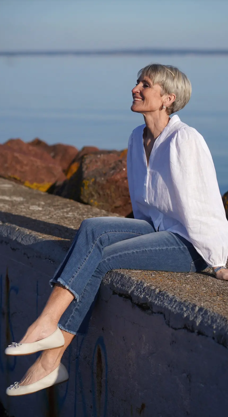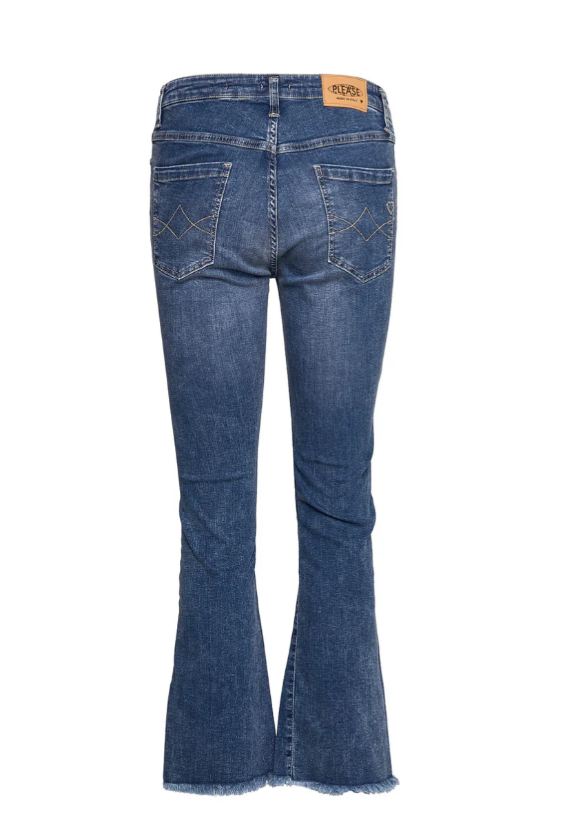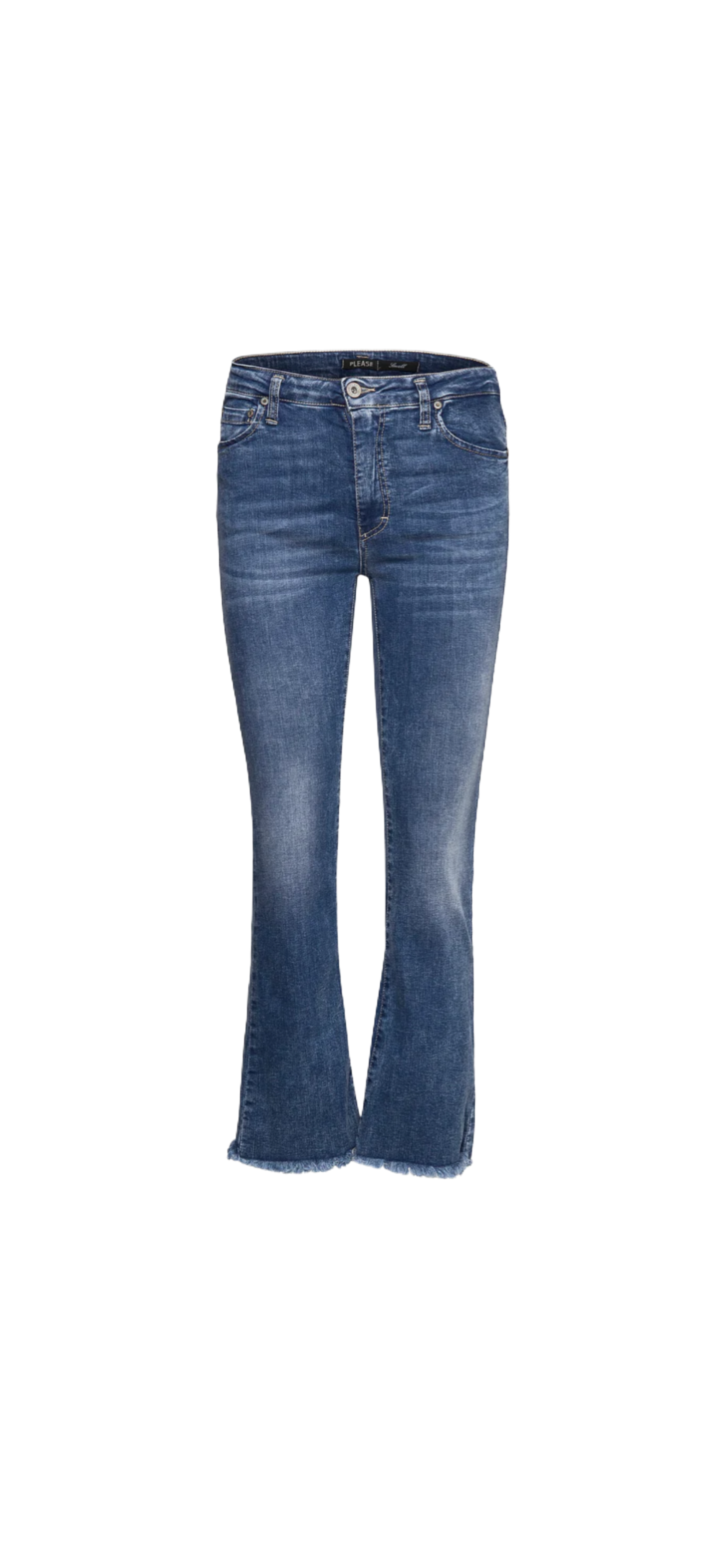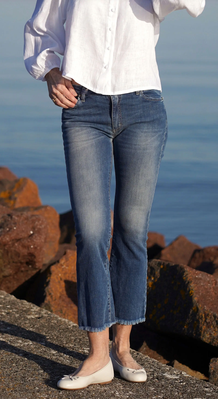 Jeans i cropped lengde med råkant nederst og liten sleng.
