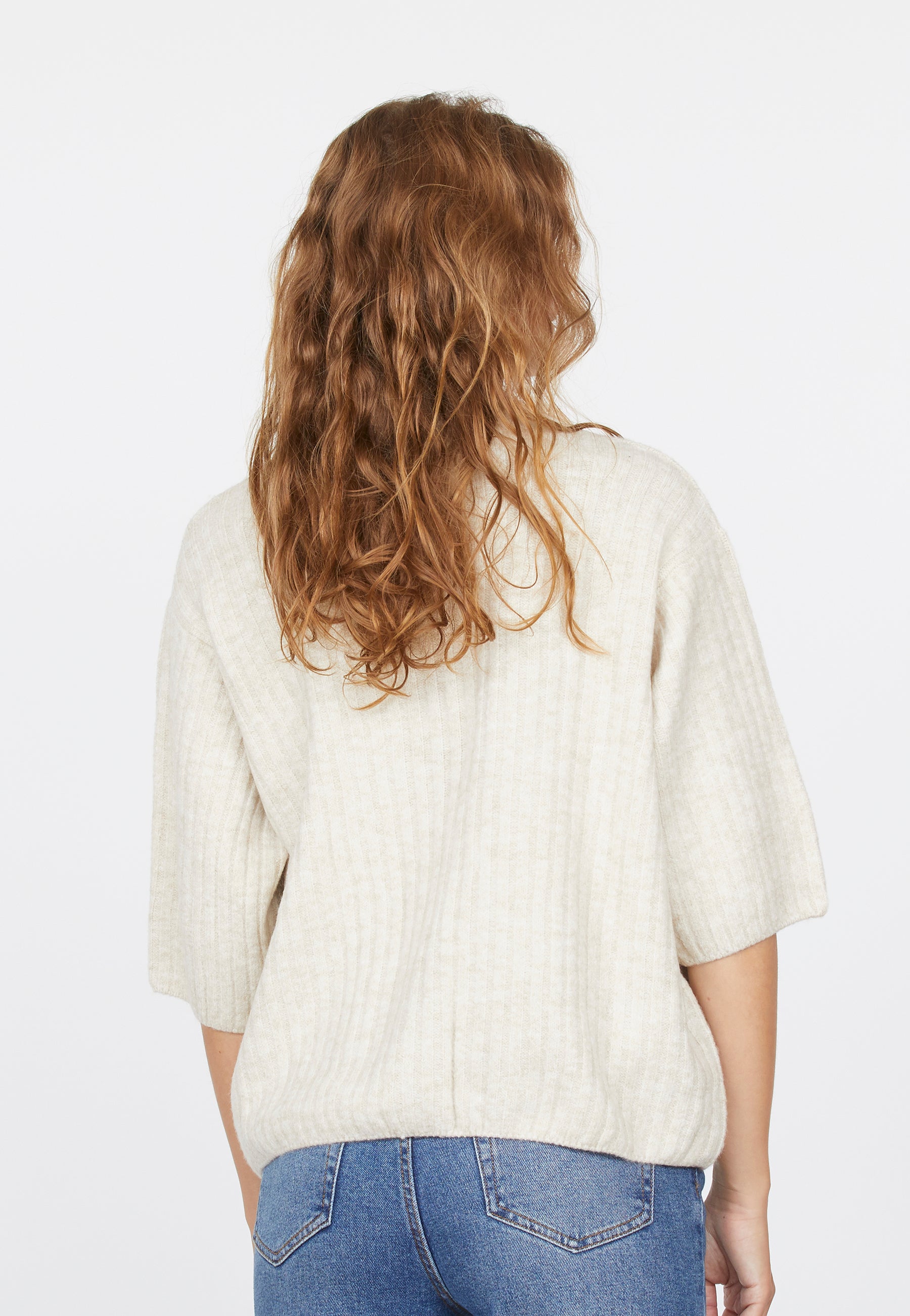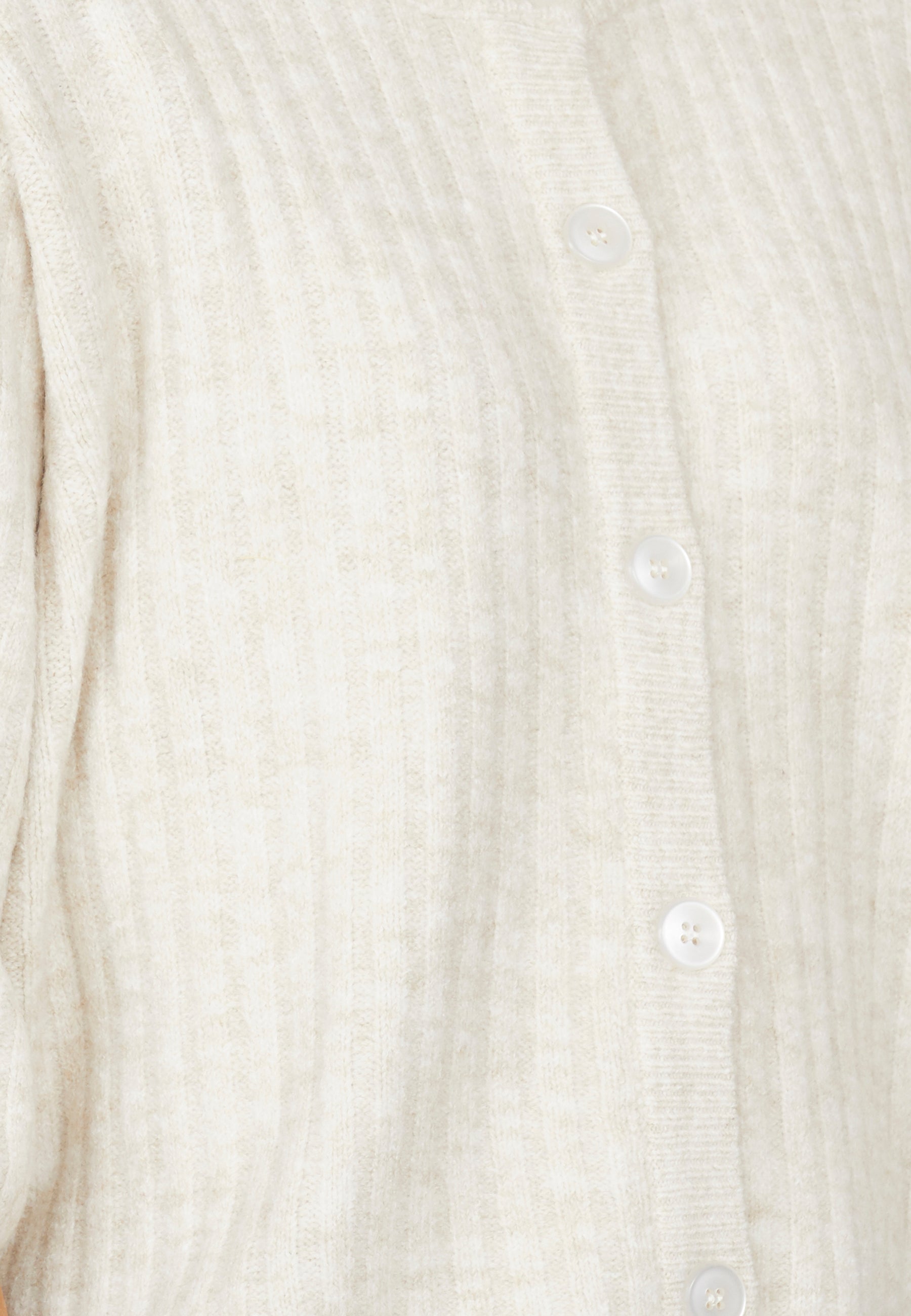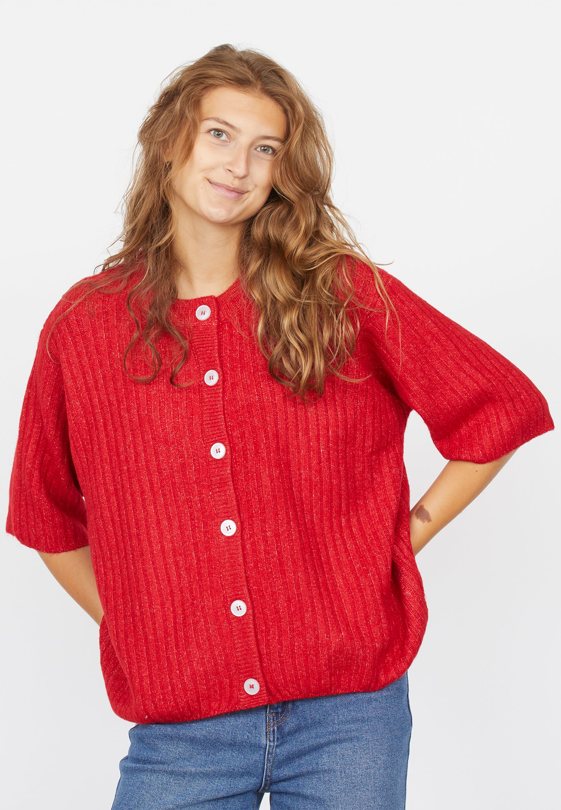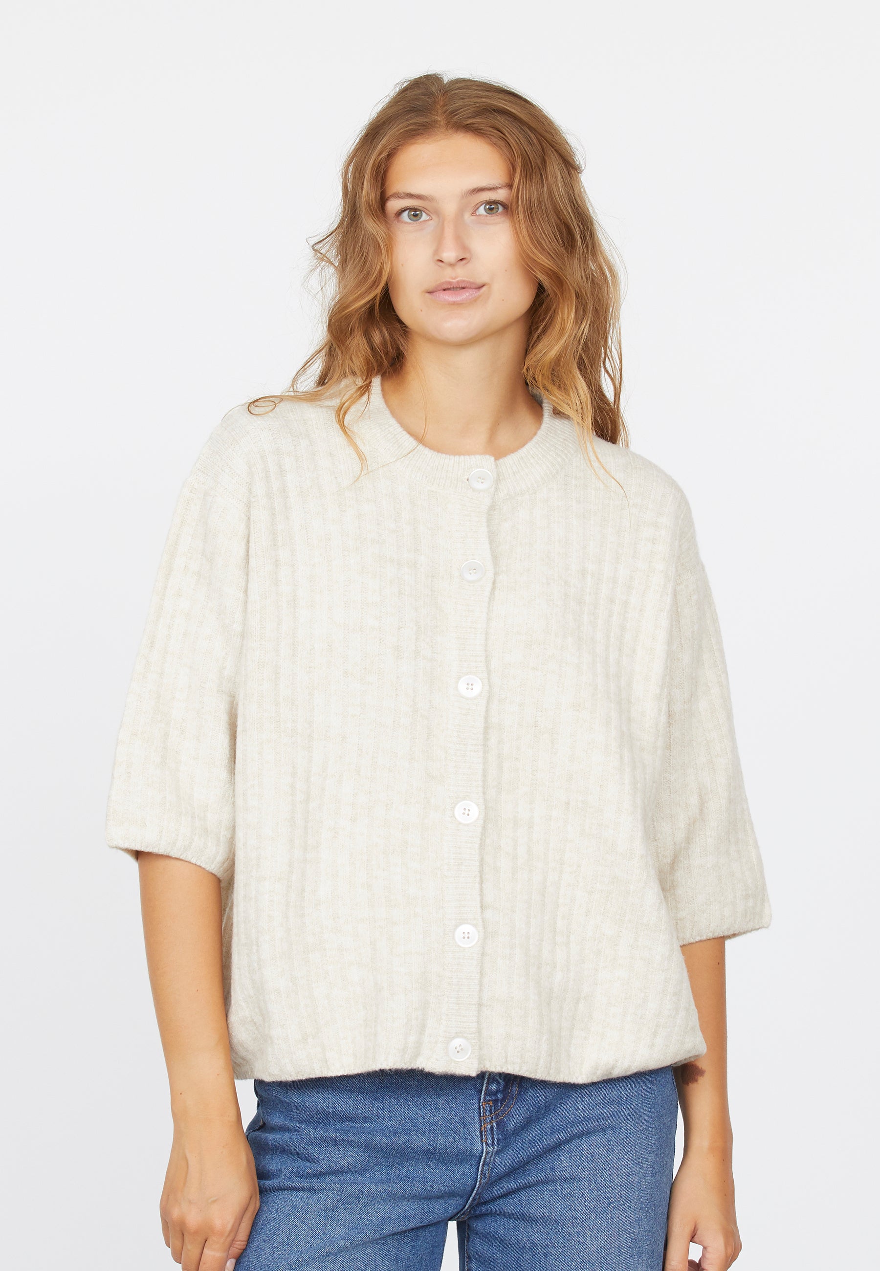 Holea er en løs og ribbet cardigan med 3/4 ermer. Cardiganen har knapper på fremsiden og en rund hals. Modellen har en størrelse S på.