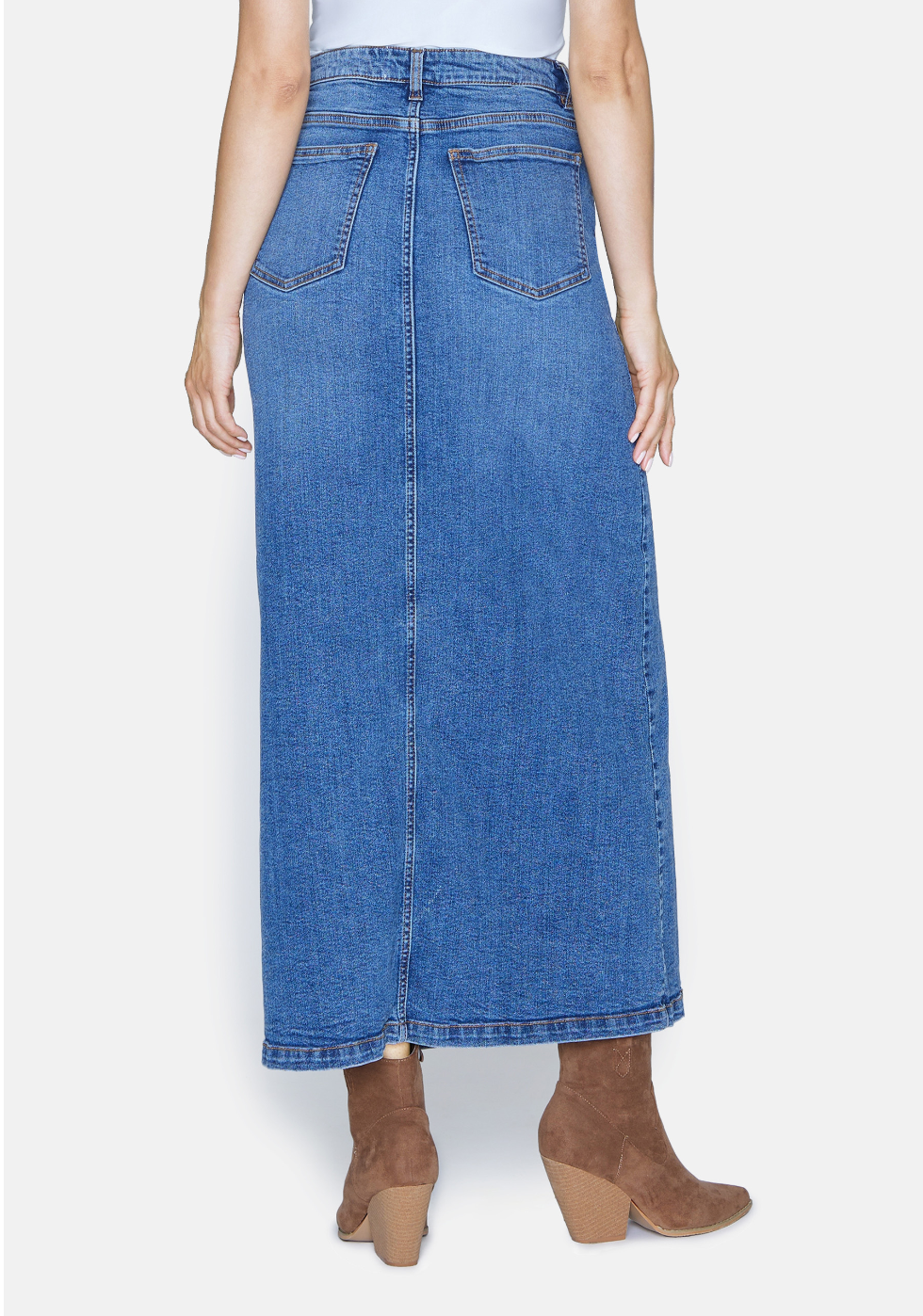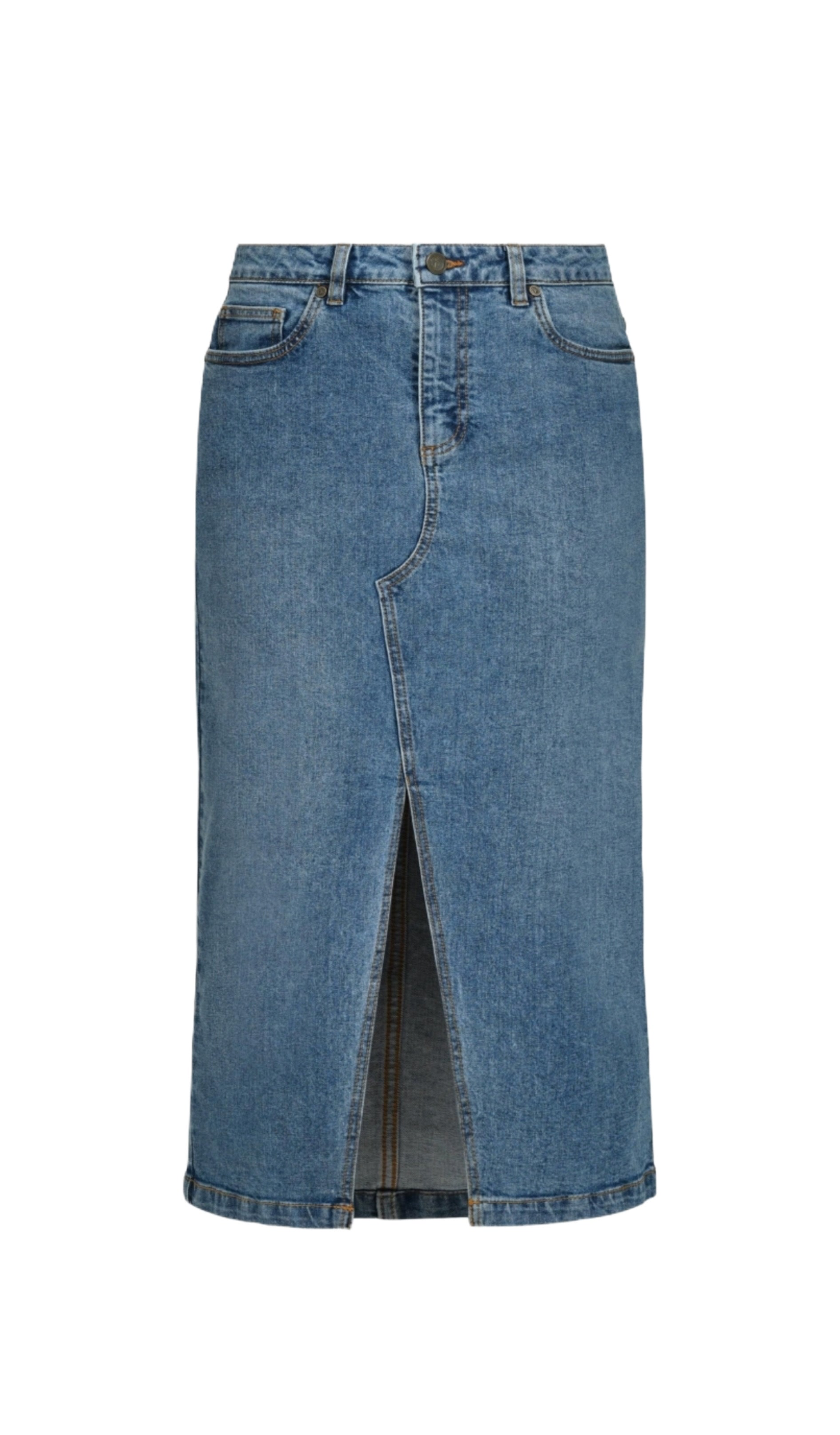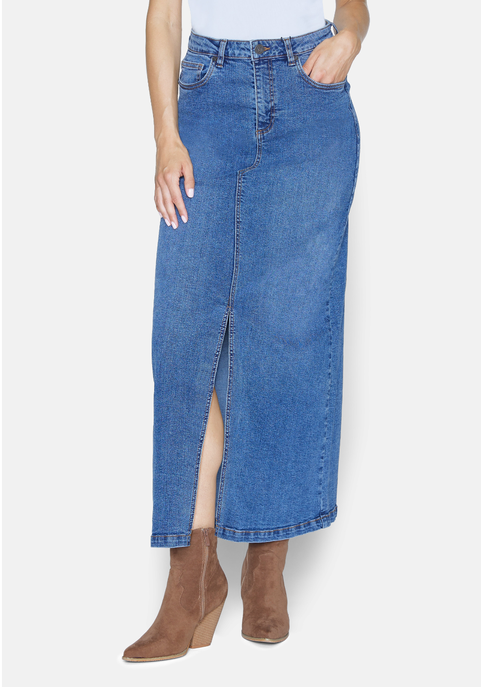 OLIA er et trendy langt denim-skjørt med en split foran. Denimskjørtet er tettsittende, og har en behagelig passform. Den har både lommer foran og bakpå samt beltestropper.